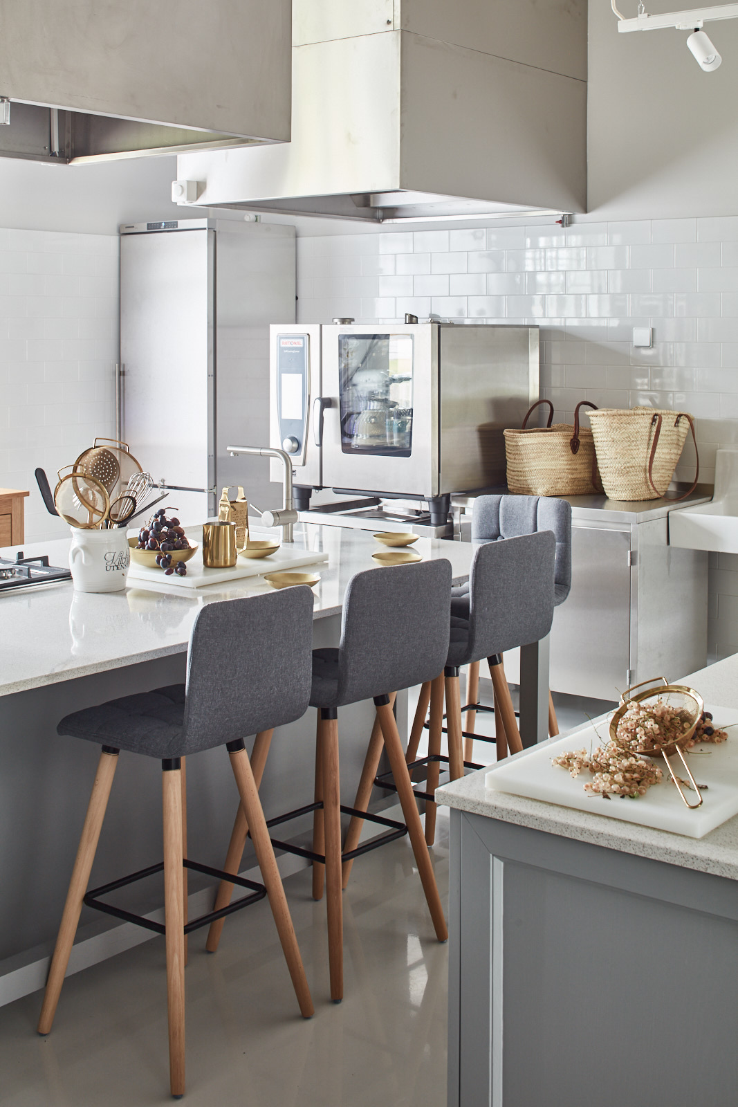 Otwarta kuchnia hotelowa z wielofunkcyjnym piecem, białymi płytkami, kwarcową wyspą i trzema szarymi hokerami.