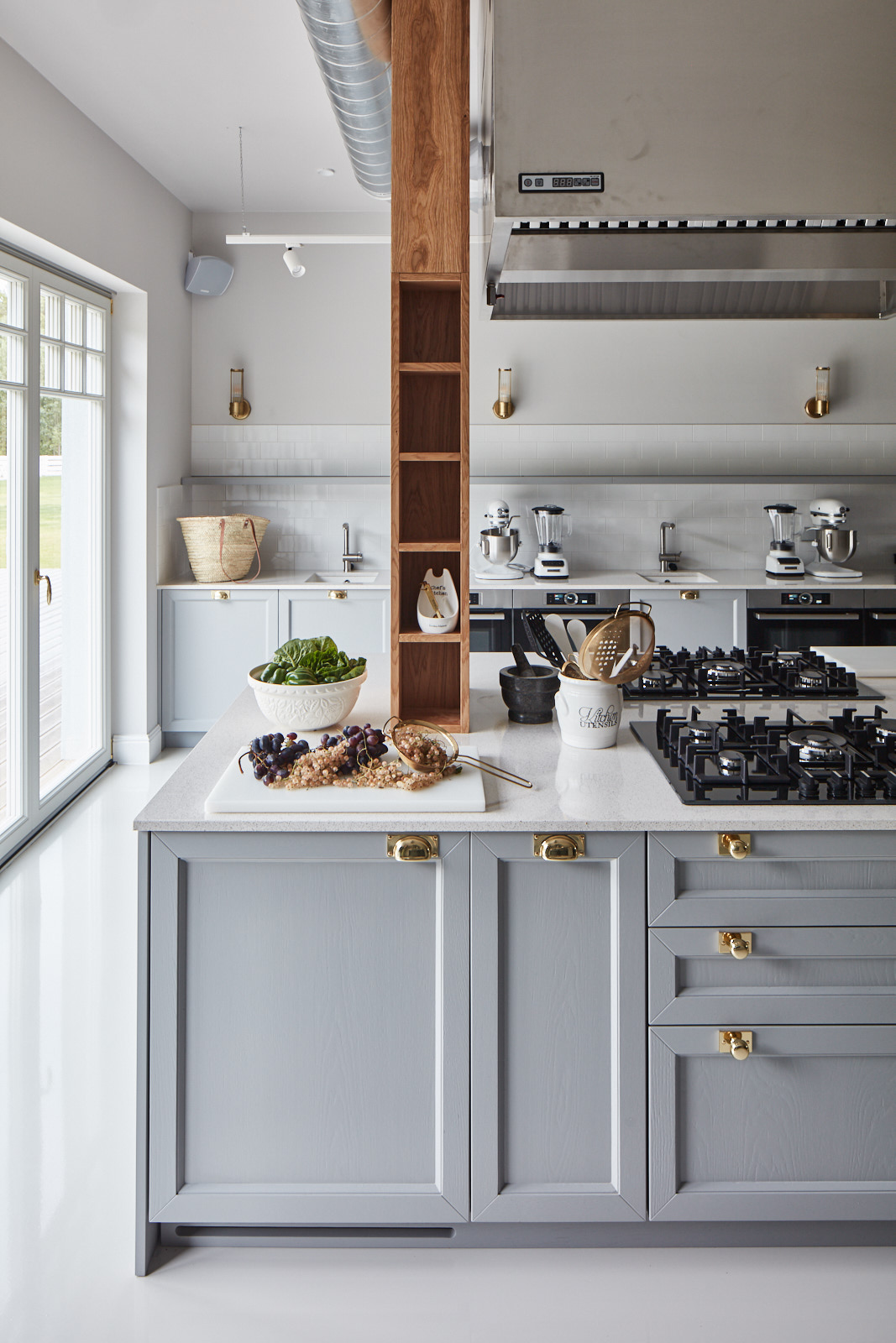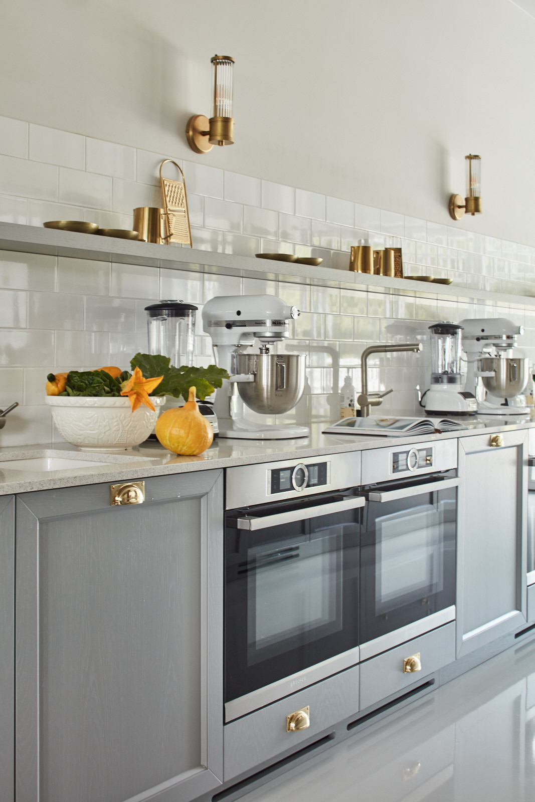 Kuchnia z szarymi szafkami, podwójnymi piekarnikami, mikserami i blenderem, białymi płytkami typu metro i złotymi akcentami.