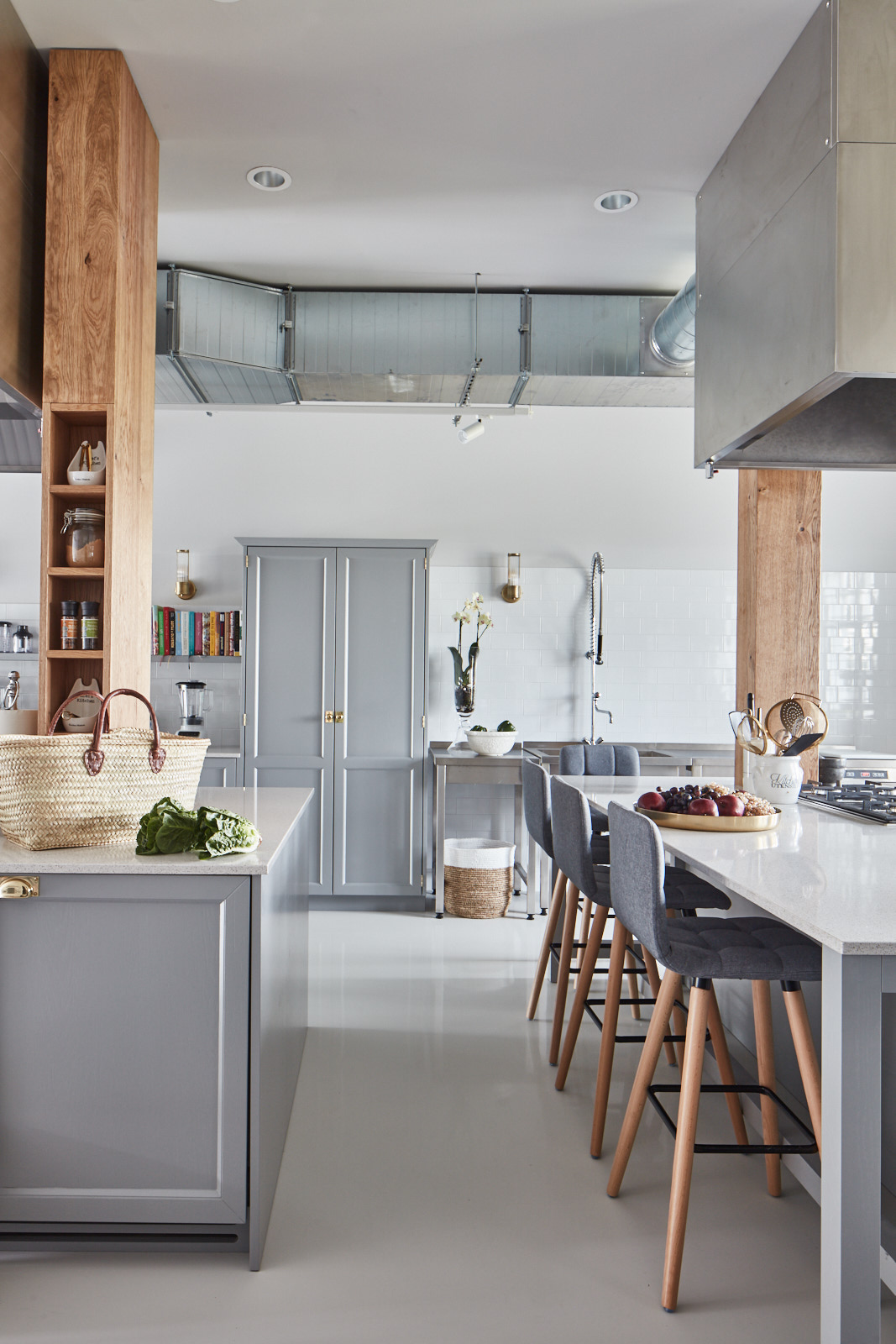 Jasna nowoczesna kuchnia z szarą wyspą i marmurowym blatem, czterema szarymi hokerami, odsłoniętym kanałem i drewnianymi belkami.