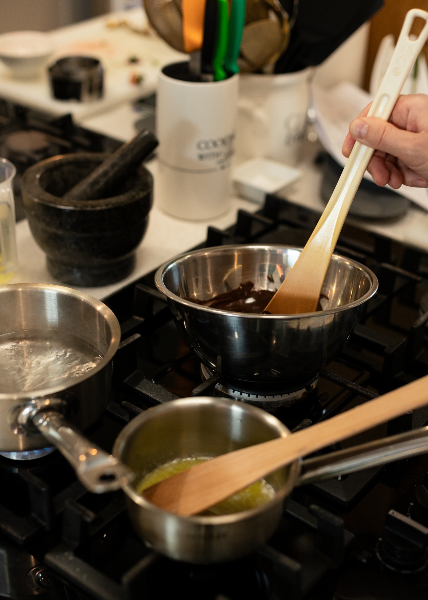 Ręka mieszająca roztopioną czekoladę w stalowej misce na kuchence gazowej; obok garnuszki z wrzącą wodą, masłem i drewnianymi łopatkami