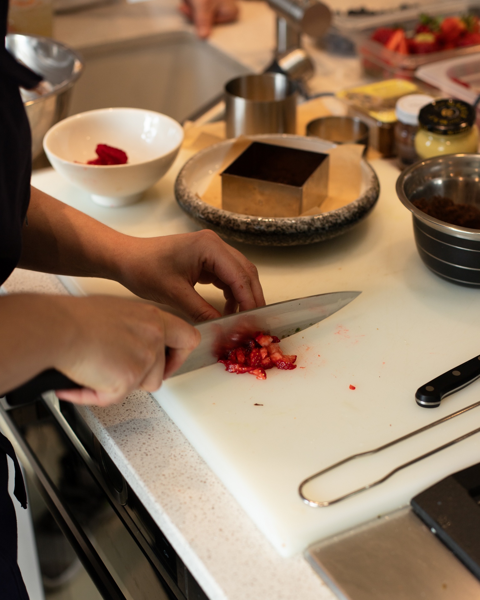 Szef kuchni sieka świeże truskawki na białej desce w hotelowej kuchni, obok form i misek.