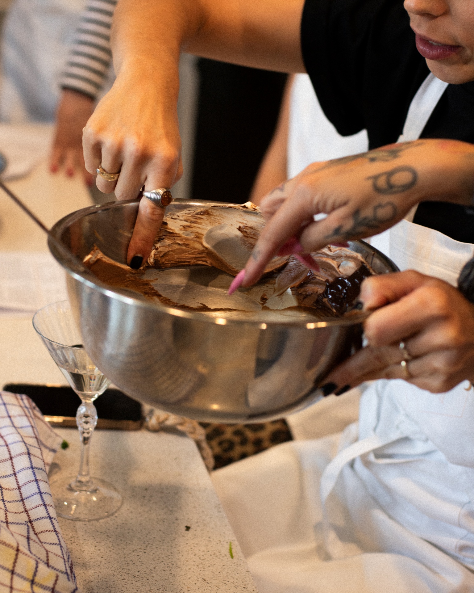 Ręce uczestników mieszające czekoladowy mus w stalowej misie podczas warsztatów cukierniczych, szpatułka i kieliszek obok