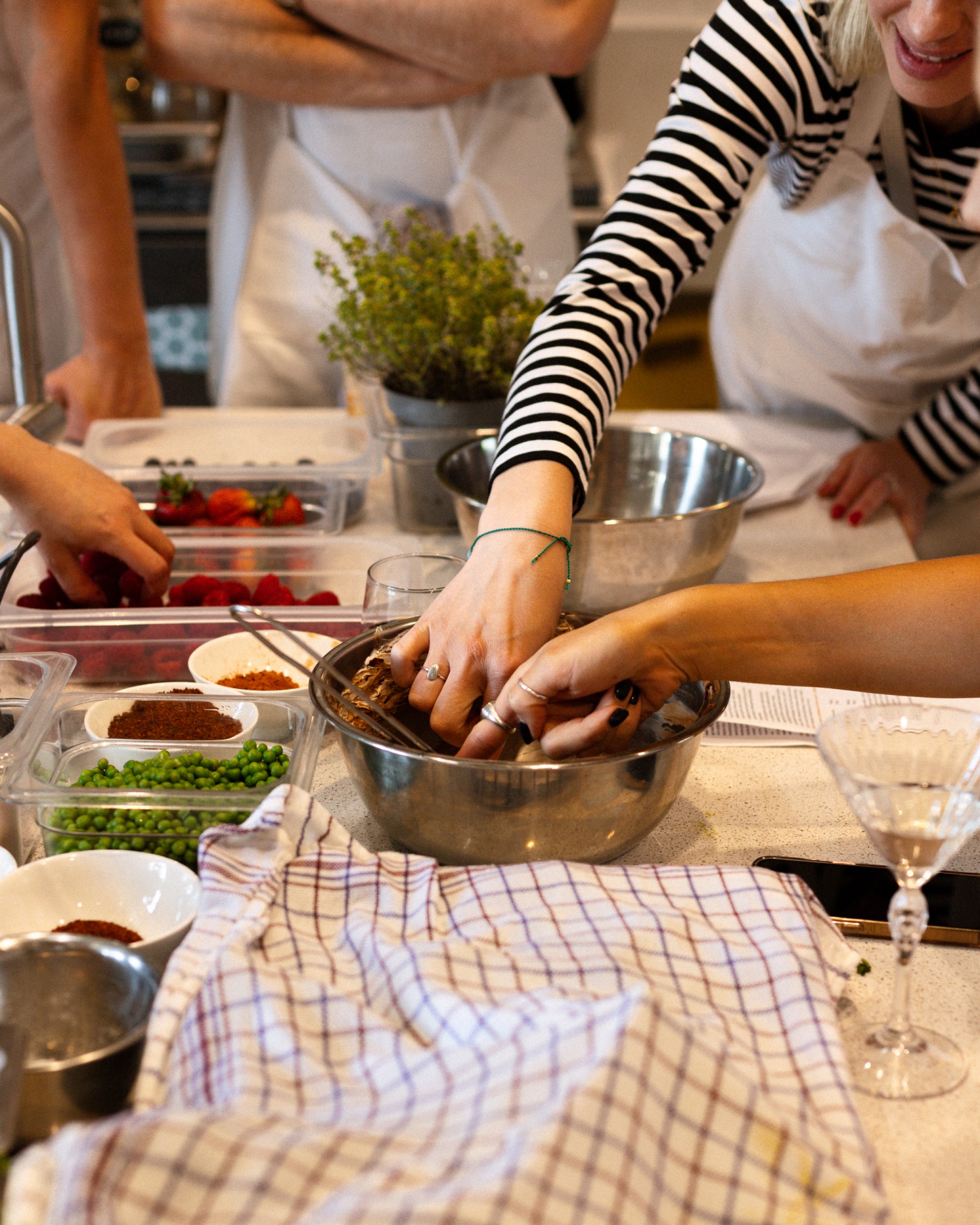 Goście w fartuchach na warsztatach kulinarnych mieszają ciasto w misce, obok pojemniki z groszkiem, truskawkami i ziołami.