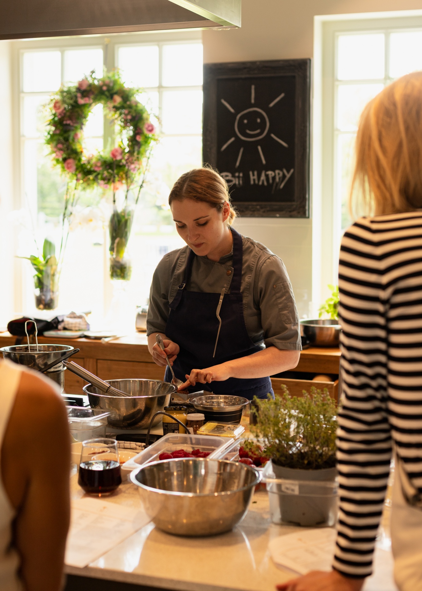Szef kuchni prowadzi warsztaty kulinarne w jasnej kuchni, przygotowując składniki ze świeżymi ziołami i owocami.
