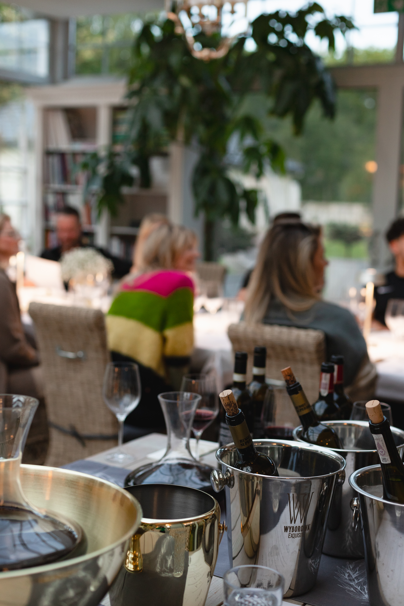 Butelki wina w metalowych wiaderkach i dekanter na stoliku degustacyjnym, goście przy świecach w przeszklonym salonie z wiklinowymi krzesłami.