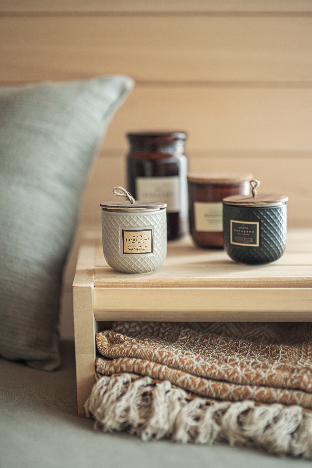 Drewniana półka z zapachowymi świecami w szklanych słoikach, złożonym wzorzystym kocem i miękką poduszką tworząca przytulny kącik w klimacie spa.