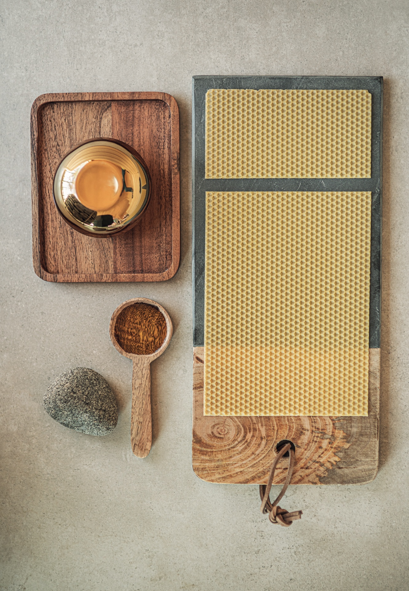 Zestaw spa: dwa plastry wosku pszczelego na drewnianej desce, drewniana łyżka z olejem, gładki kamień i złota miseczka.