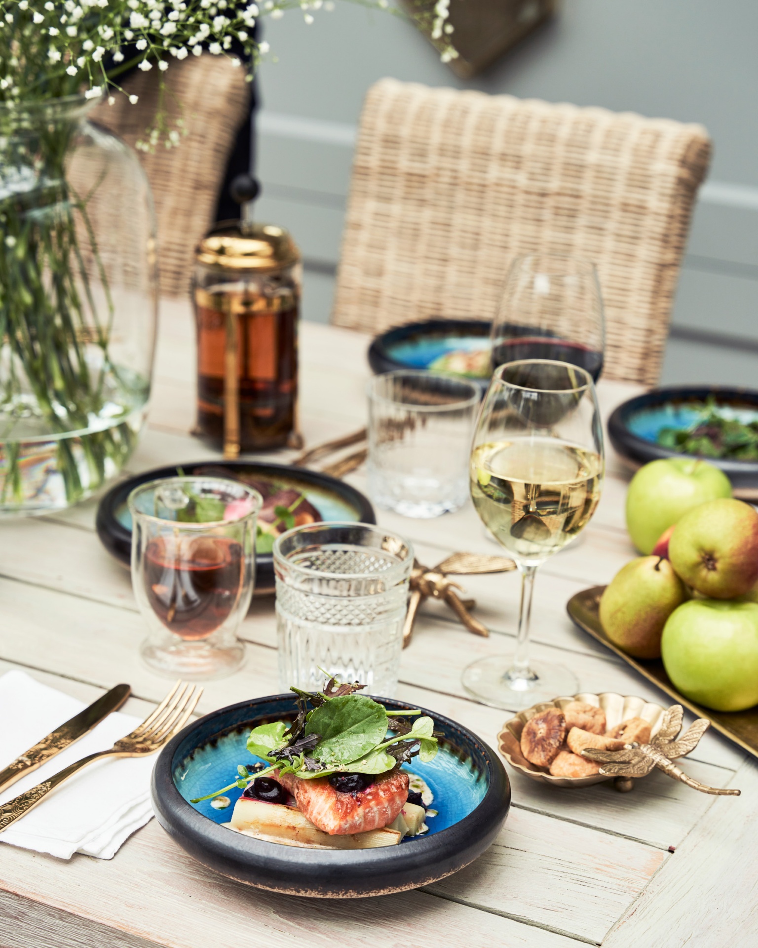 Stół z przystawką z łososia w niebieskiej misce z zieleniną, kieliszek białego wina, zaparzacz tłokowy, wyplatane krzesła i miska jabłek.