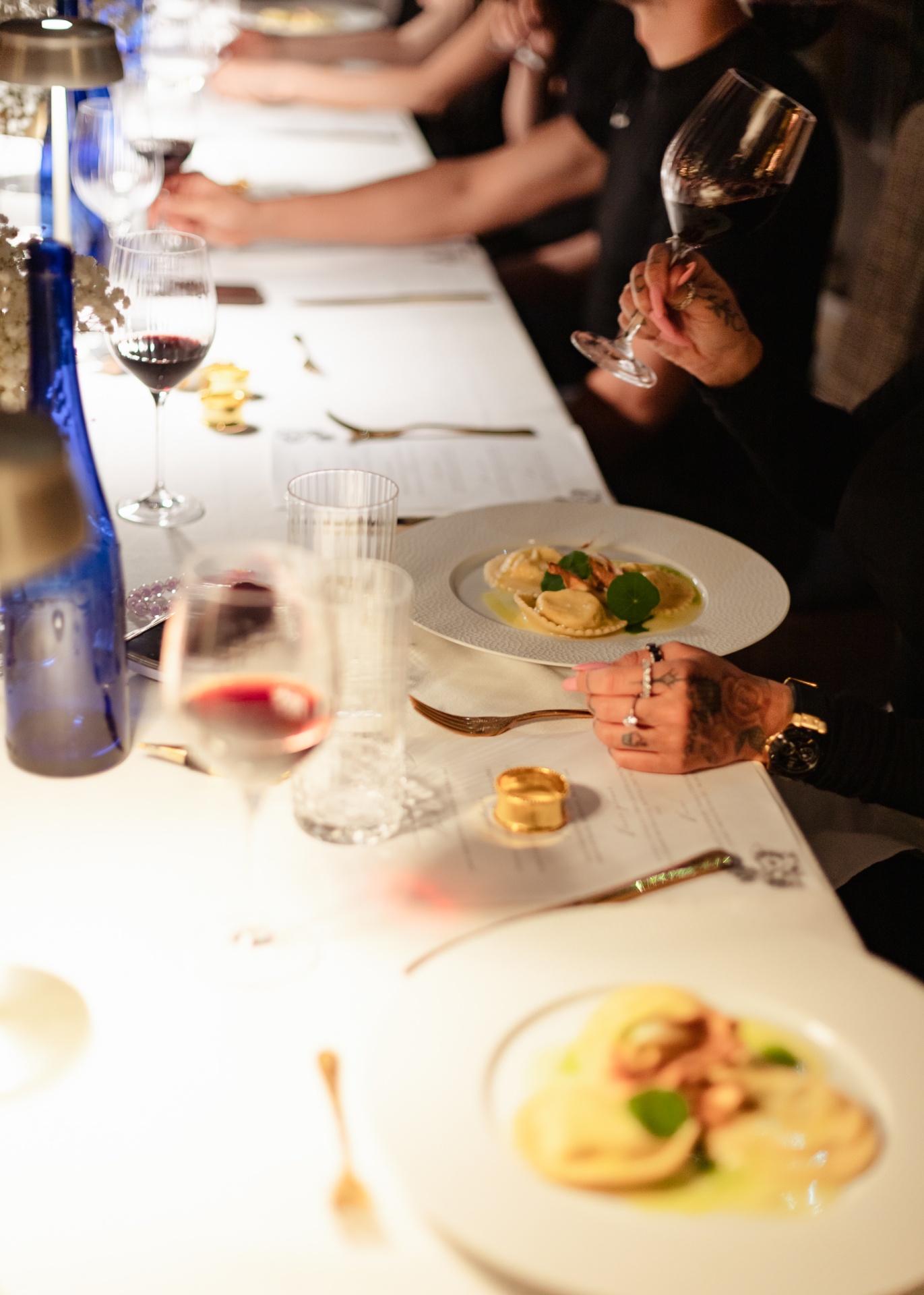 Długi stół z białym obrusem, ravioli na talerzach, goście trzymają kieliszki czerwonego wina, ciepła nastrojowa atmosfera