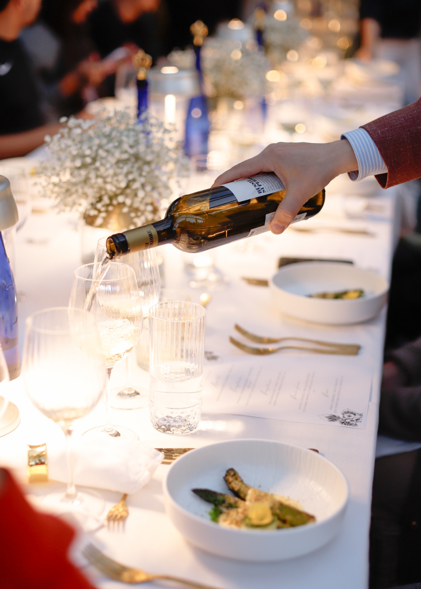 Ręka wlewa białe wino do kieliszka przy świecach, biały obrus, bukiet gipsówki, przystawka ze szparagów i złote sztućce