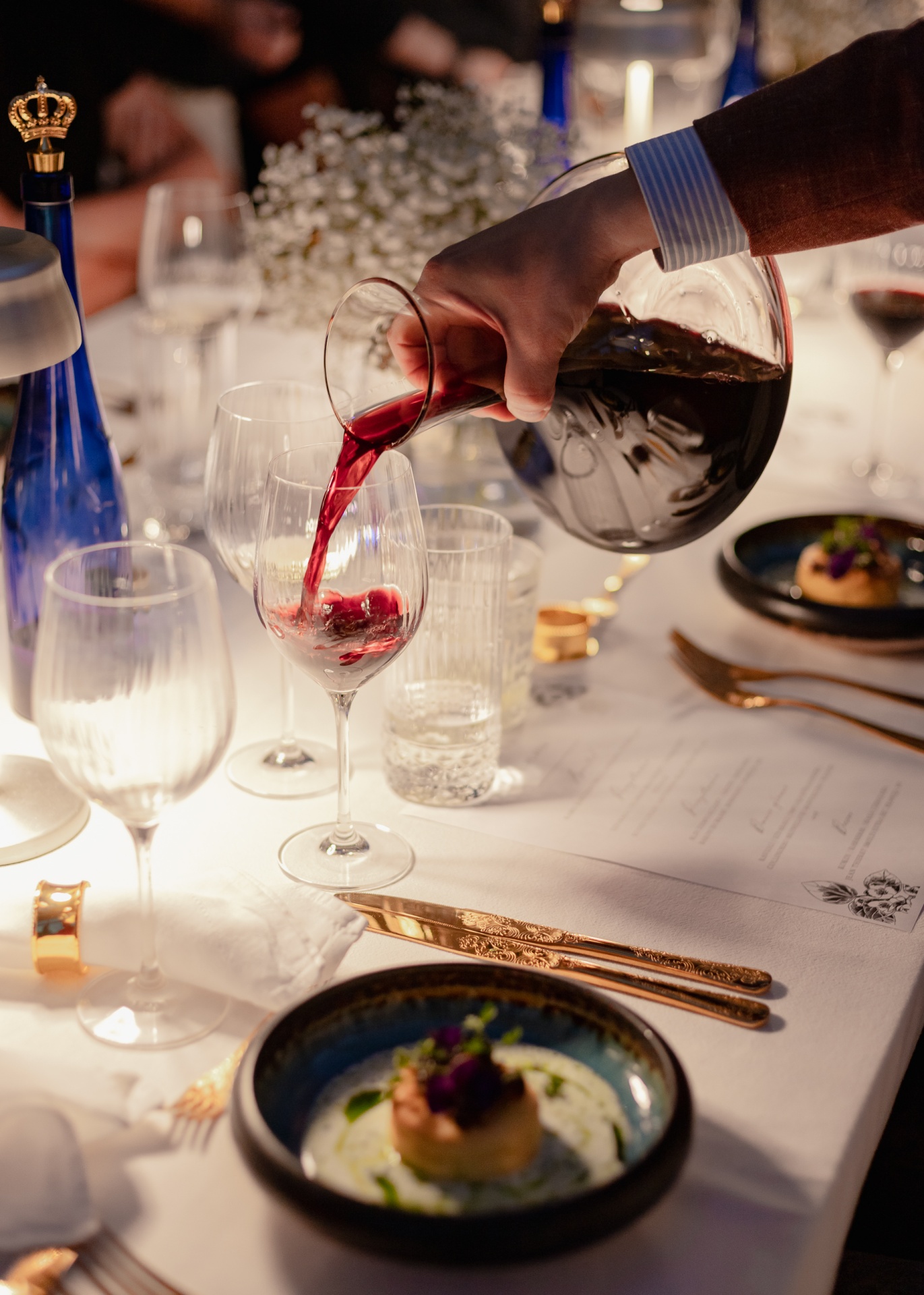 Ręka nalewa czerwone wino do kieliszka przy elegancko nakrytym białym stole ze złotymi sztućcami i małą przystawką