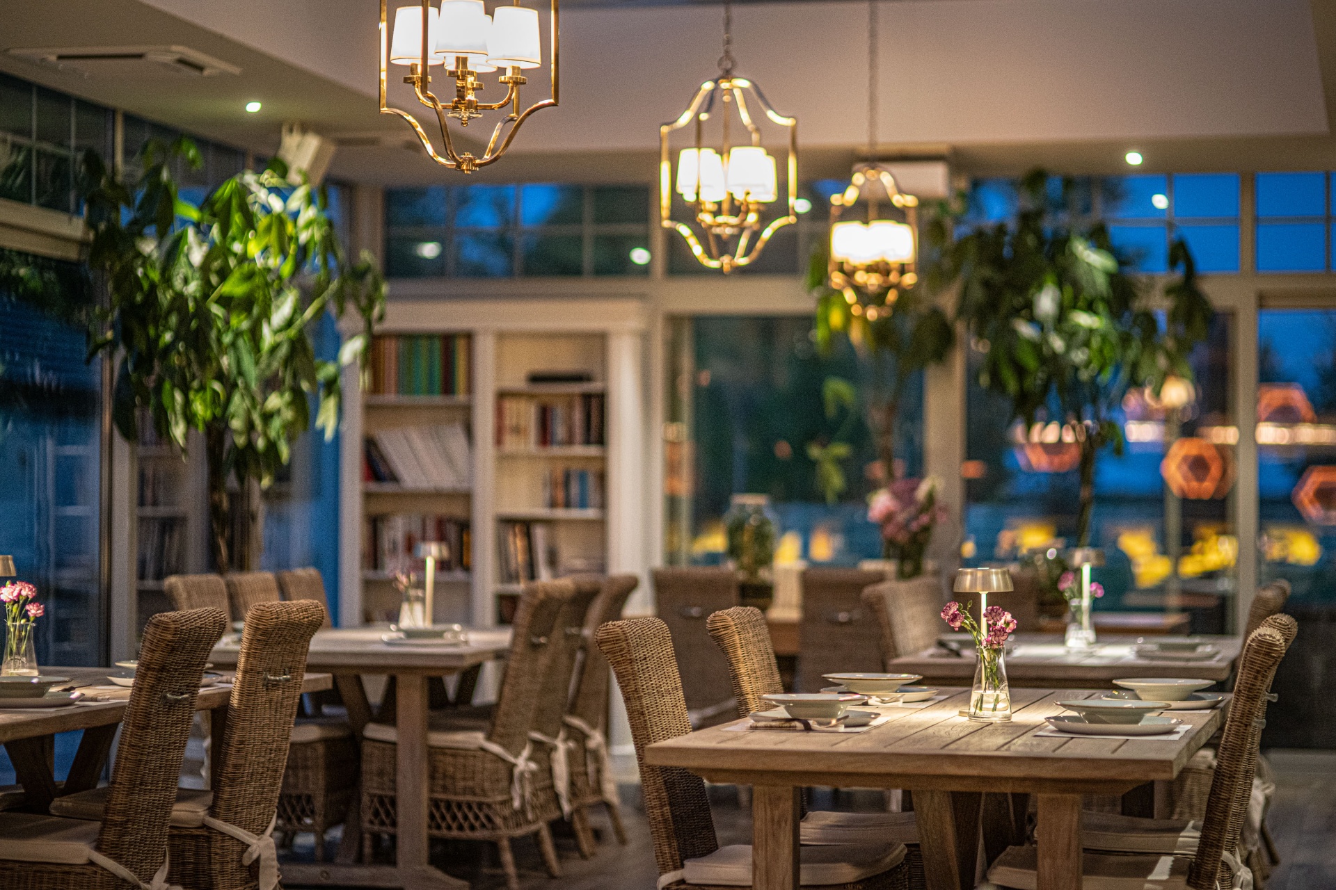 Przytulna restauracja hotelowa z drewnianymi stołami nakrytymi do kolacji, rattanowymi krzesłami, ciepłym oświetleniem i wazonikami przy oknach.