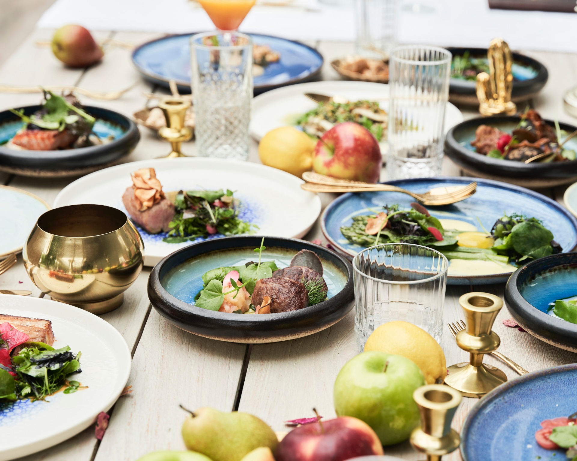 Wspólne degustacyjne dania na niebieskiej ceramice, świeże owoce, kryształowe szklanki i mosiężne świeczniki na stole
