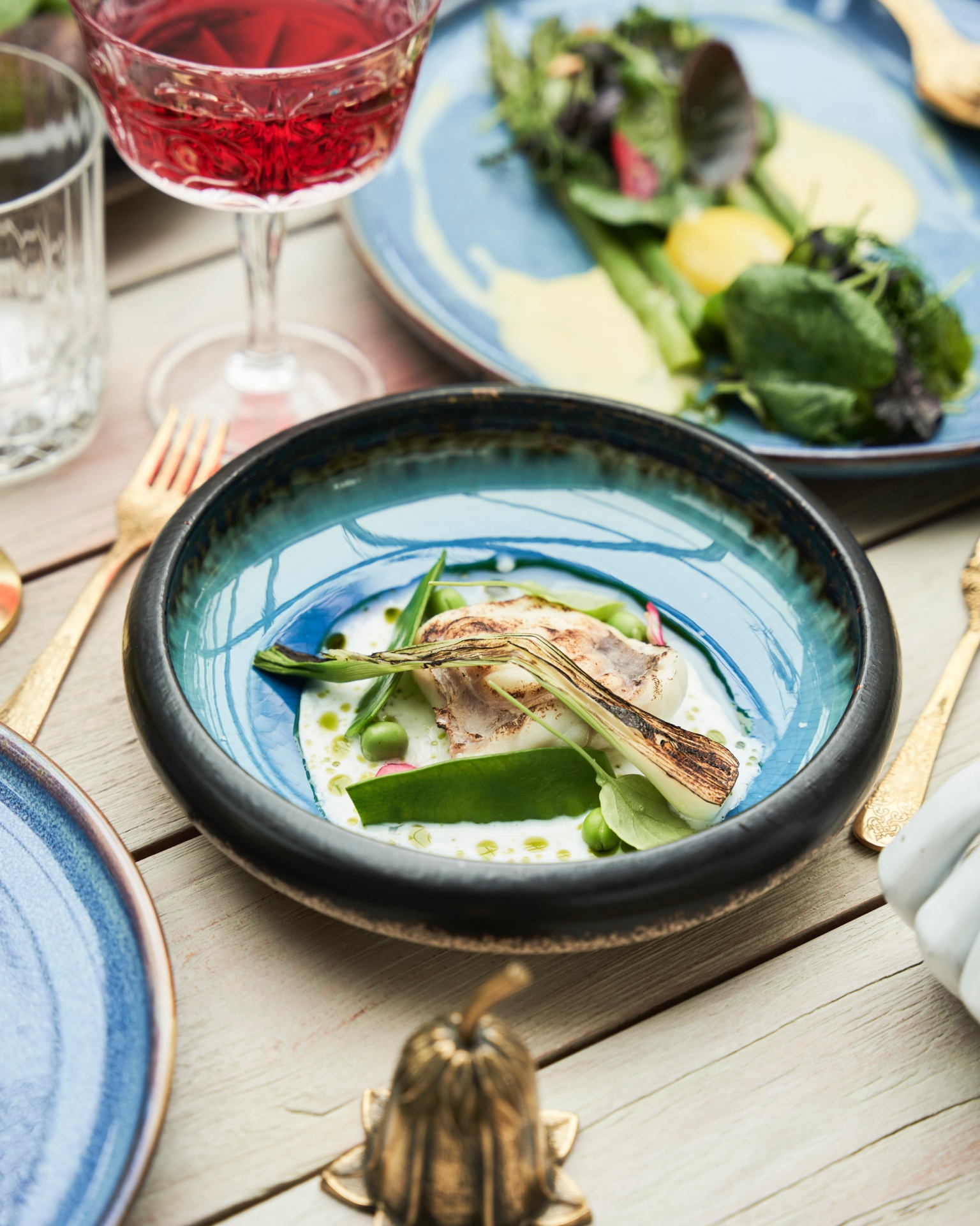 Grillowana dymka i małż św. Jakuba z groszkiem w kremowym sosie w niebieskiej ceramicznej misce, złote sztućce i kieliszek czerwonego wina