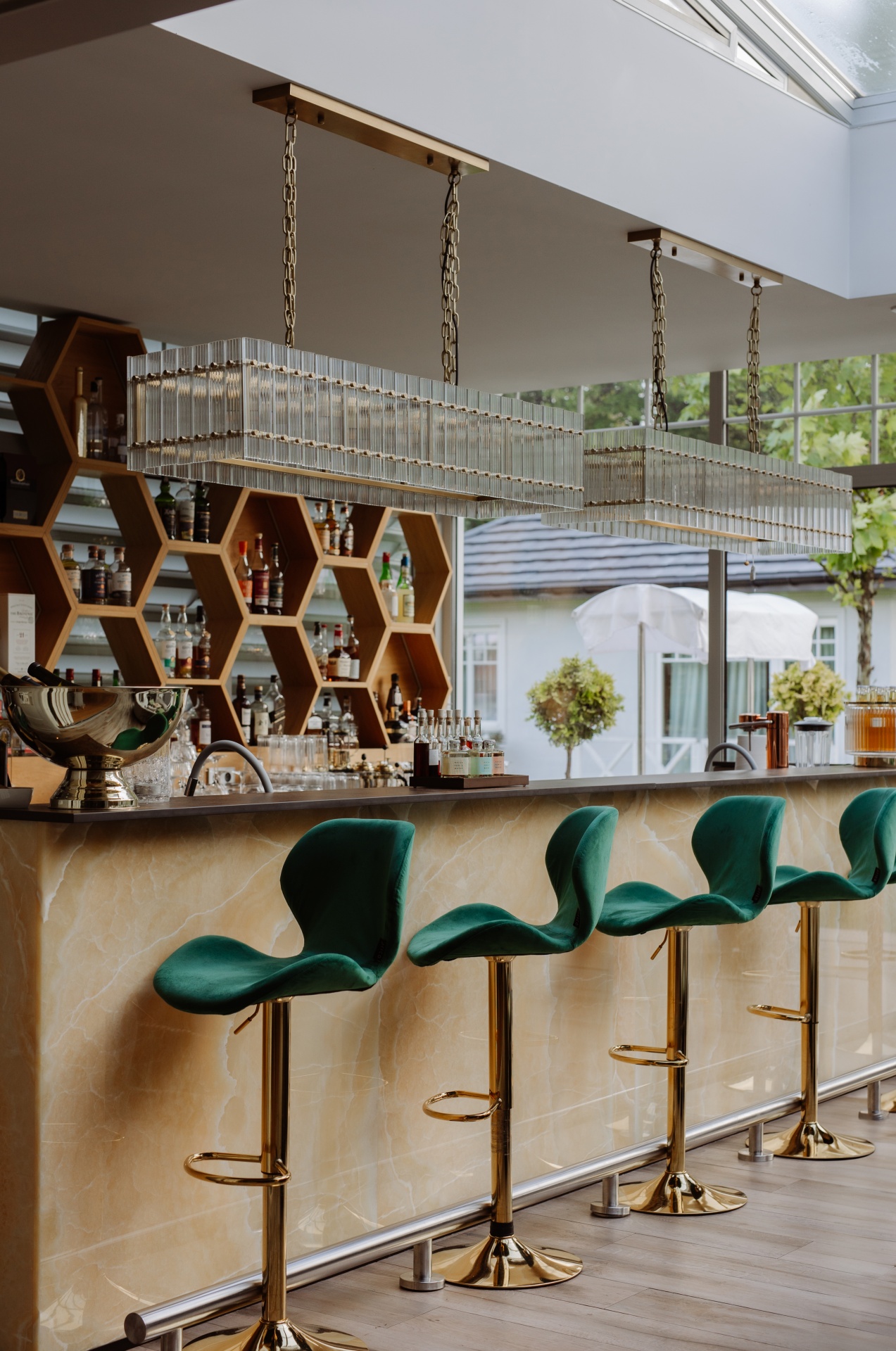 Bar hotelowy z zielonymi aksamitnymi hokerami, marmurowym blatem, sześciokątnymi półkami na alkohole i szklanymi lampami, widok na ogród.
