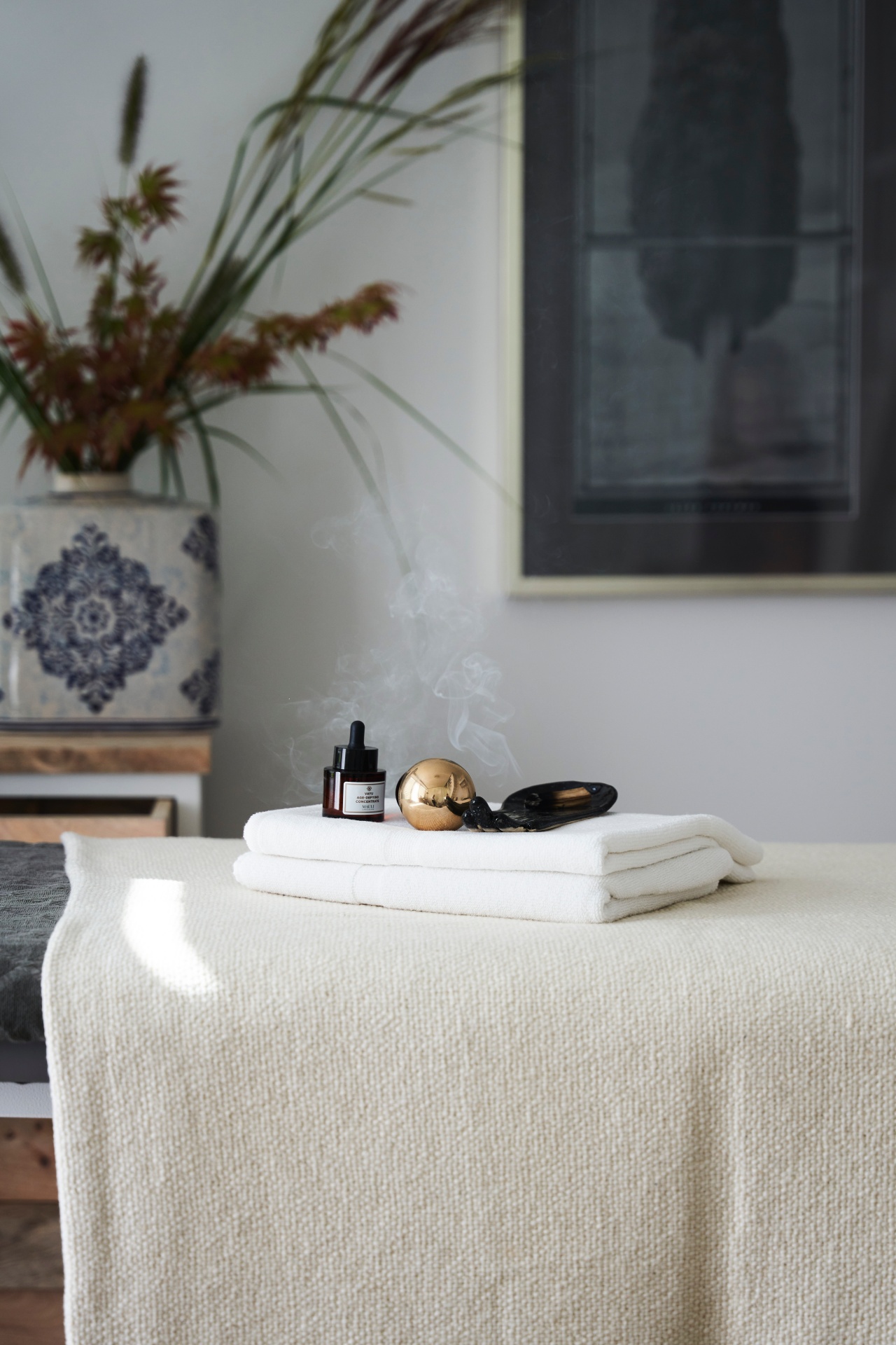 Stół do zabiegów spa z białymi ręcznikami, olejkiem aromaterapeutycznym i unoszącym się dymkiem kadzidła, w spokojnym wnętrzu.