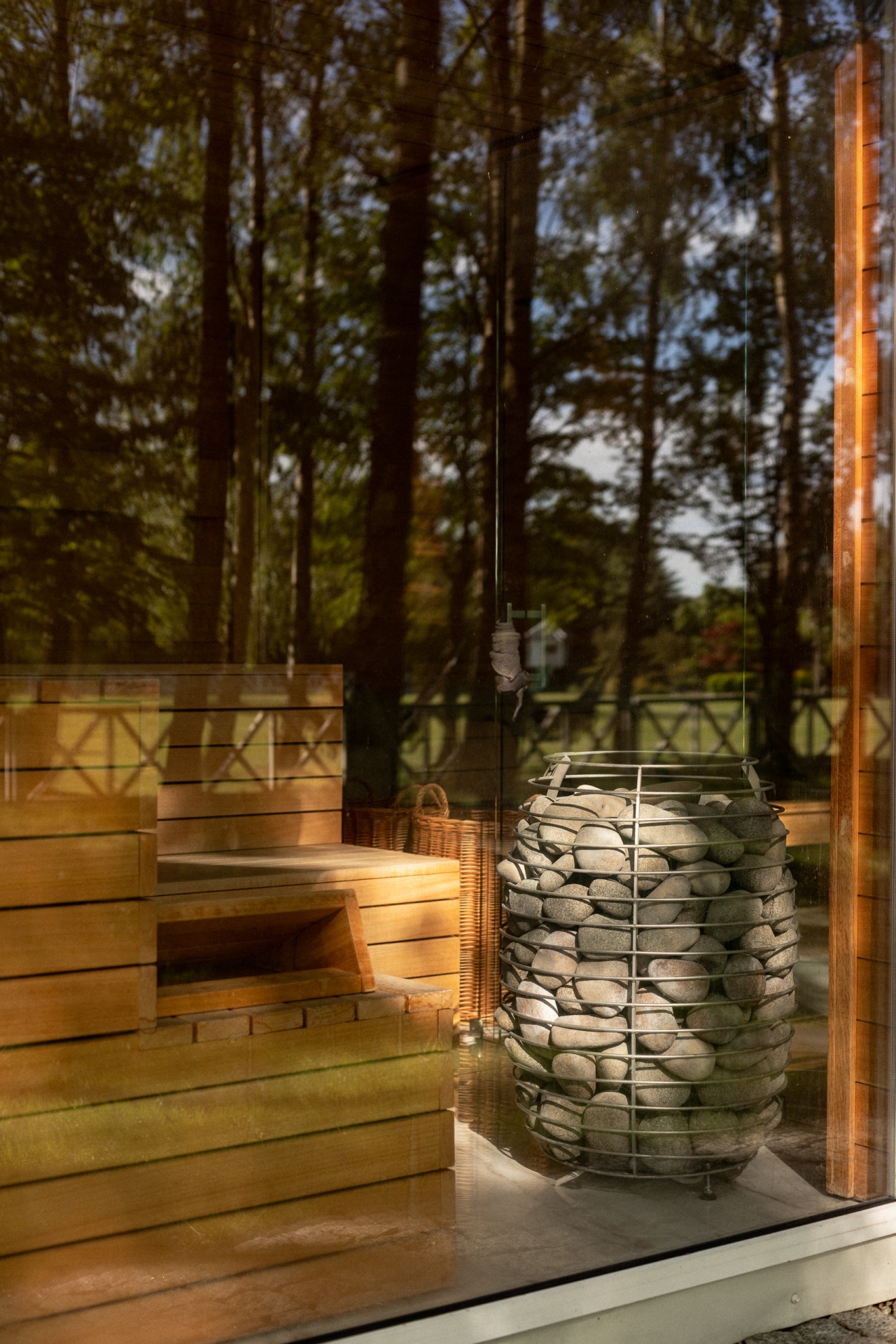 Drewniana sauna z przeszkloną ścianą, ławkami i metalowym piecem wypełnionym kamieniami oraz widokiem na las.