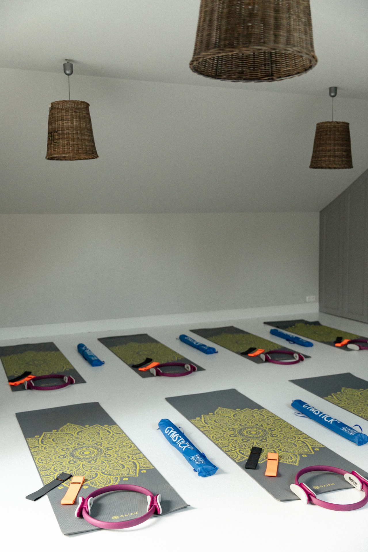 Jasne hotelowe studio pilates z rzędami mat do jogi, obręczami pilates, taśmami oporowymi i wiklinowymi lampami, gotowe na zajęcia grupowe