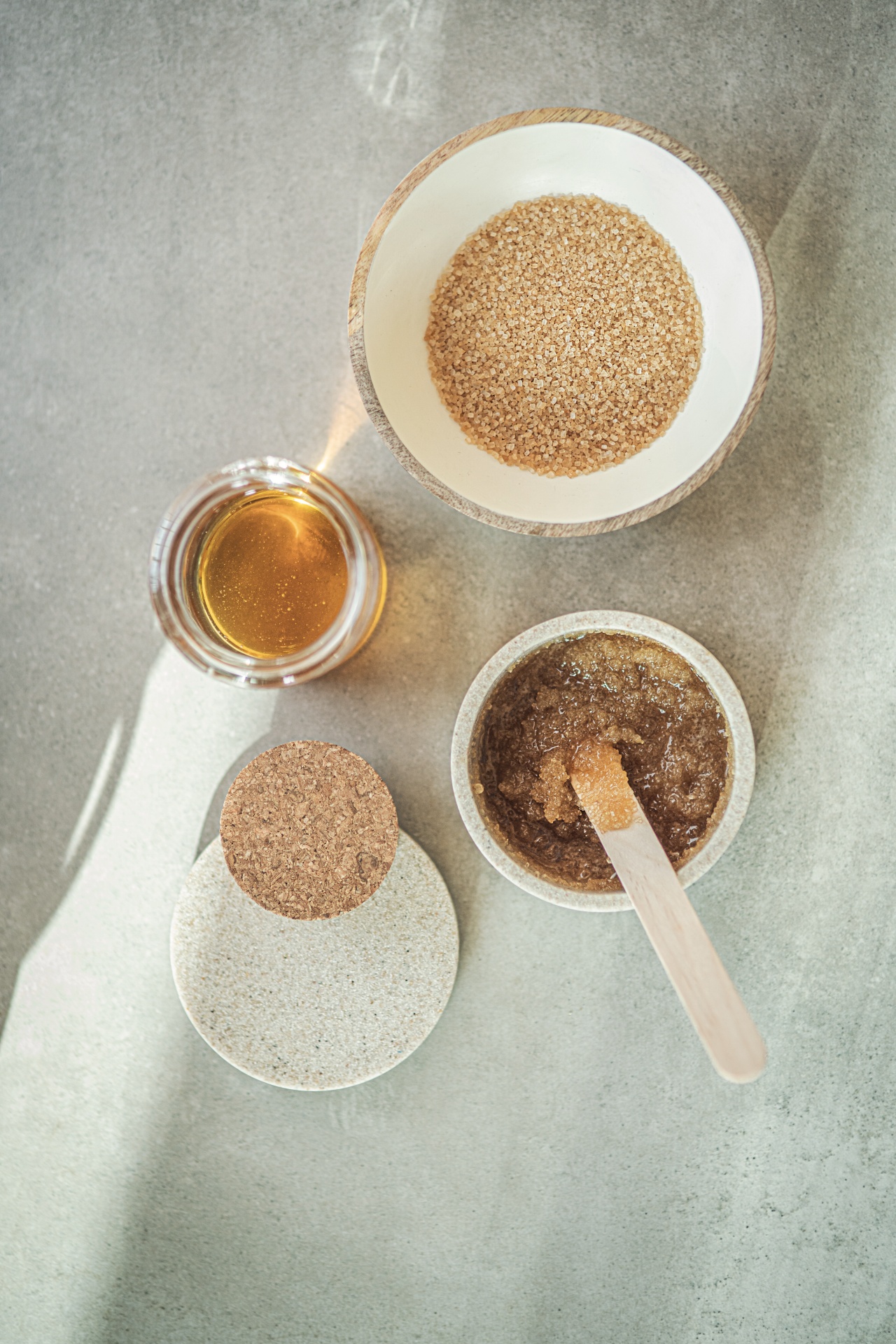 Miska z grubym brązowym cukrem, słoik złotego oleju i miseczka z peelingiem oraz drewniana szpatułka — naturalny zestaw spa.