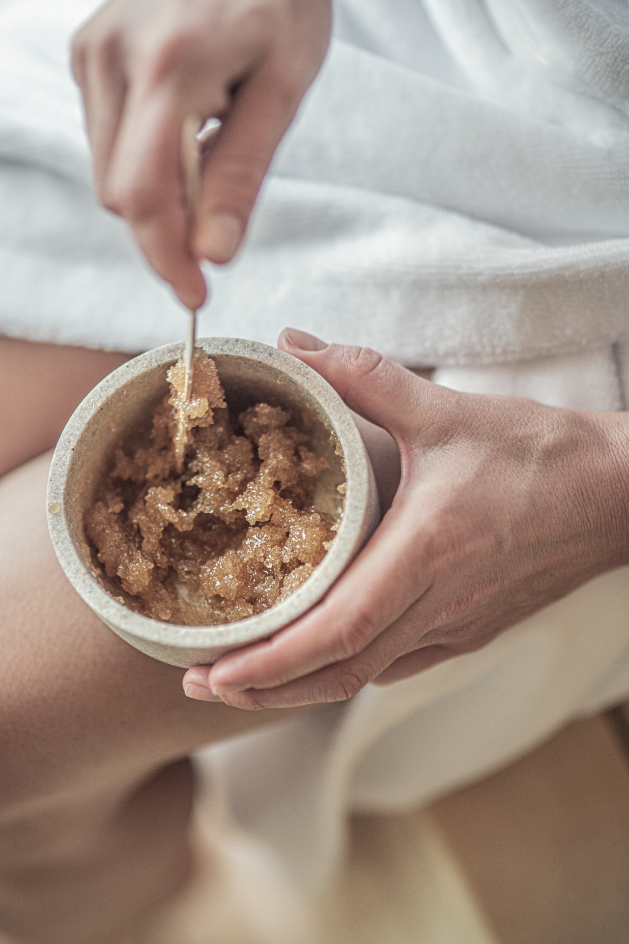 Ręce nabierające brązowego peelingu cukrowego z kamiennej miseczki, gość w białym szlafroku przed zabiegiem spa