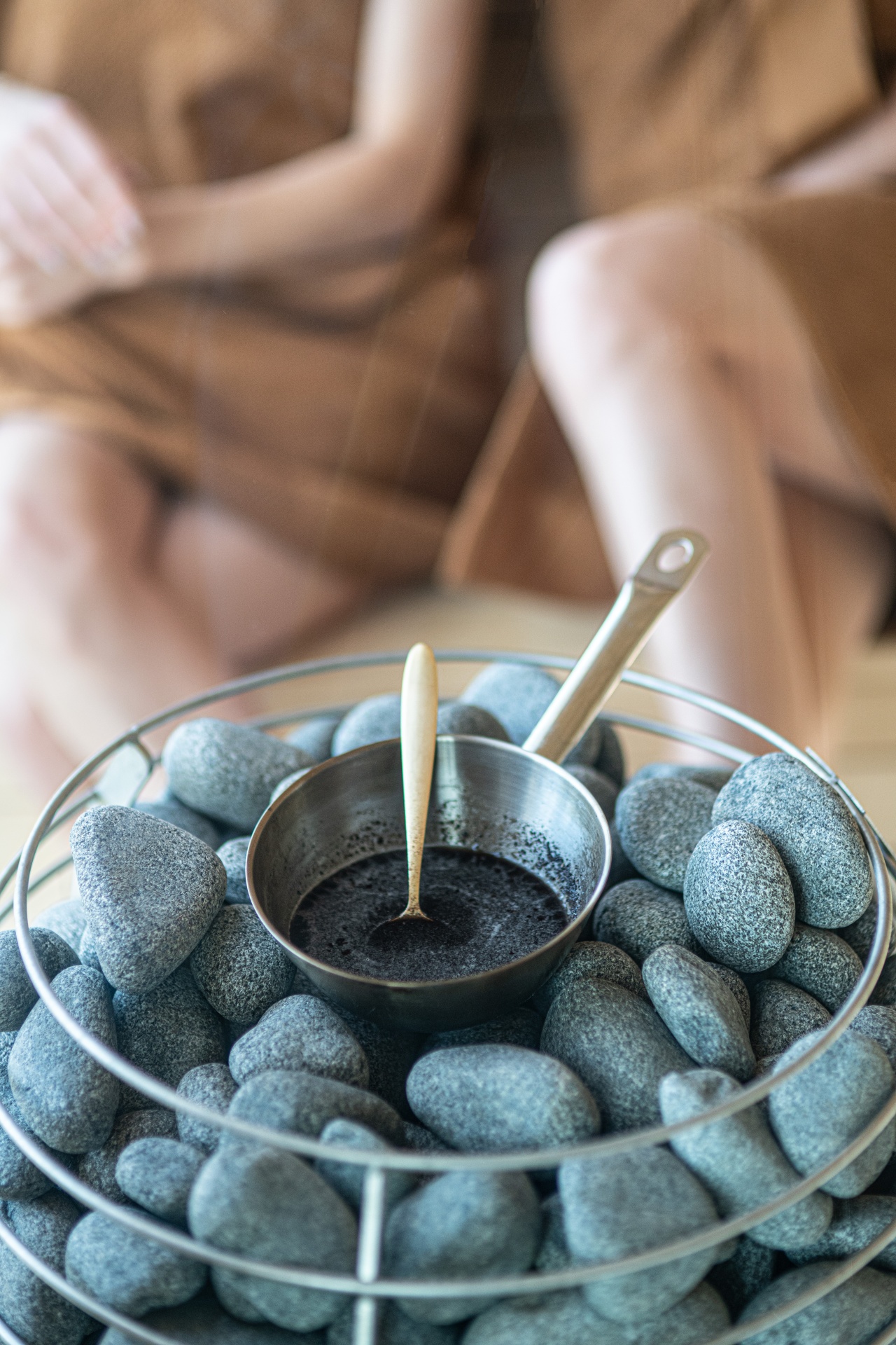 Metalowa miseczka z ciemnym peelingiem i łyżką na gładkich kamieniach sauny, w tle rozmyte osoby w szlafrokach