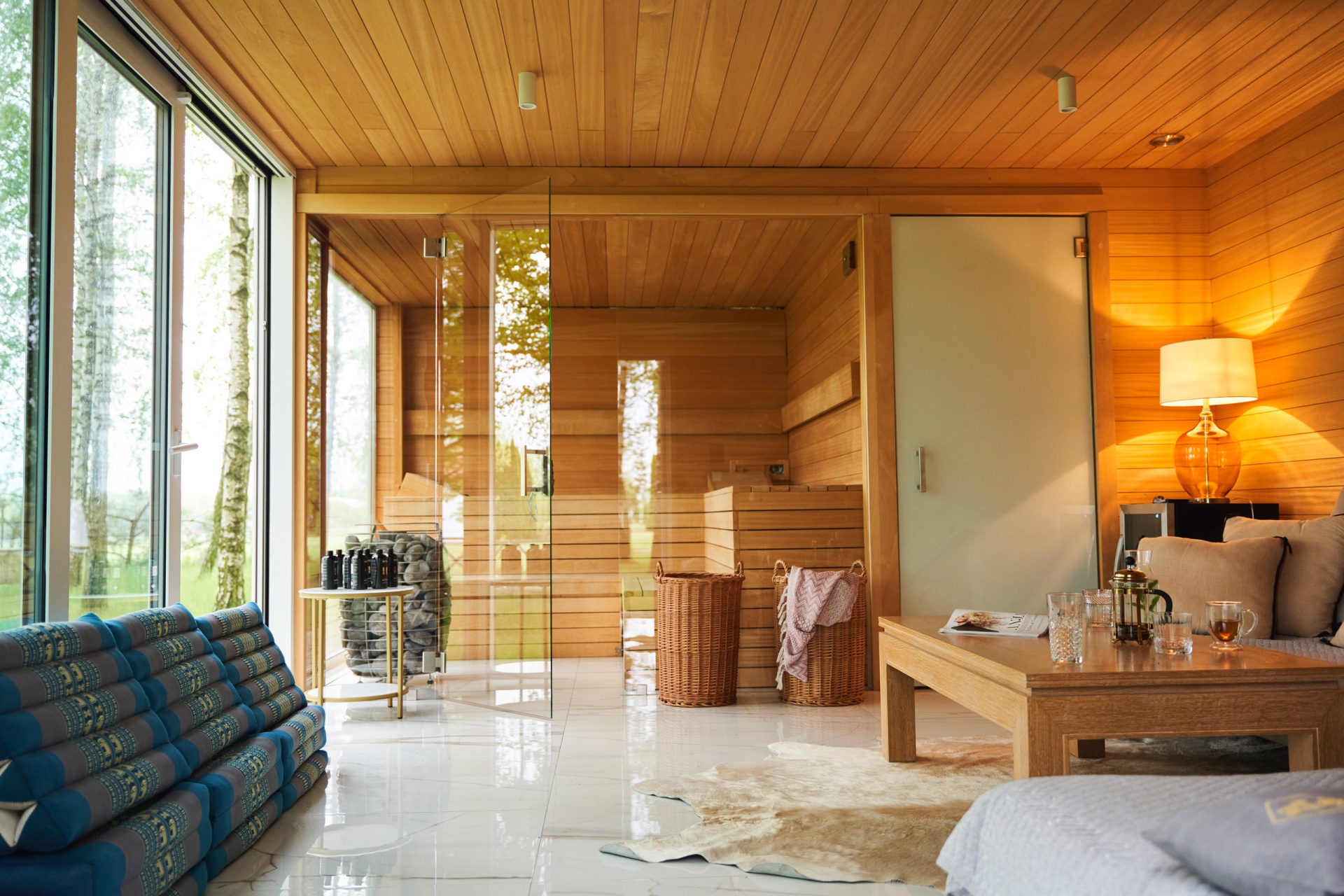 Sauna z drewnianym wnętrzem i przeszklonymi drzwiami obok przytulnego salonu, widok na las, wiklinowe kosze i herbata.