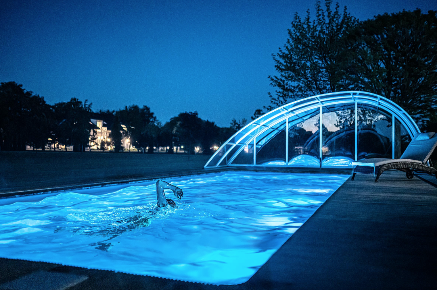 Nocny basen na zewnątrz z niebieskim oświetleniem, gość płynie kraulem przy zakrzywionej, przesuwnej szklanej kopule, leżak i oświetlony hotel w tle.