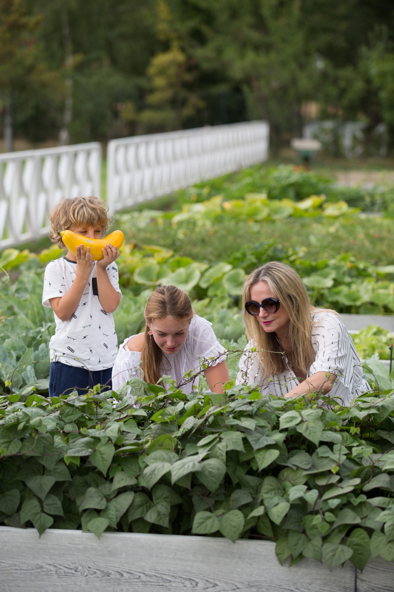 Rodzina zbiera warzywa w podwyższonej grządce, mama i nastolatka oglądają zieleninę, a chłopiec zabawnie trzyma żółtą cukinię