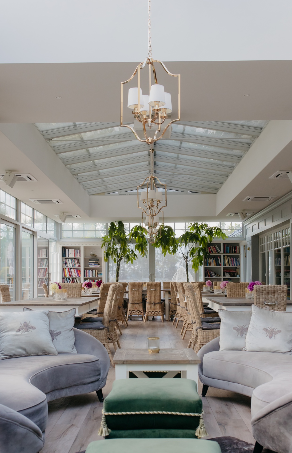 Jasna oranżeria z przeszklonym dachem, złotymi żyrandolami, wiklinowymi krzesłami, zielonymi drzewkami, miękkimi sofami i regałami.