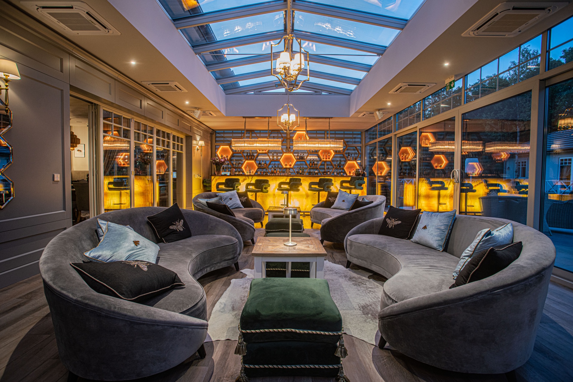 Luksusowy salon hotelowy z zaokrąglonymi aksamitnymi sofami, przeszklonym świetlikiem i podświetlanym sześciokątnym barem.